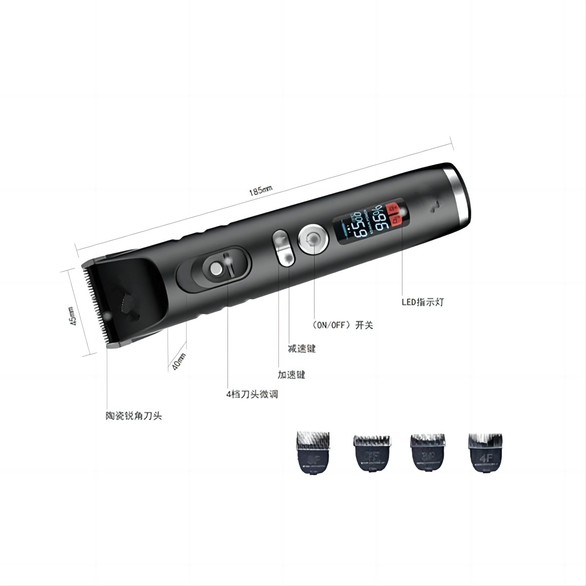 • LED obrazovka s vysokým rozlíšením zobrazuje úroveň nabitia batérie v reálnom čase, čím zabraňuje prerušeniu napájania počas úpravy a zaisťuje hladšiu domácu úpravu alebo služby salónu.