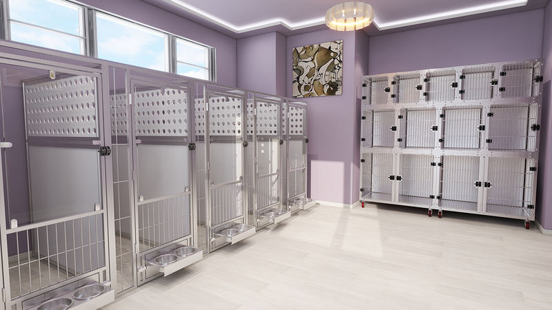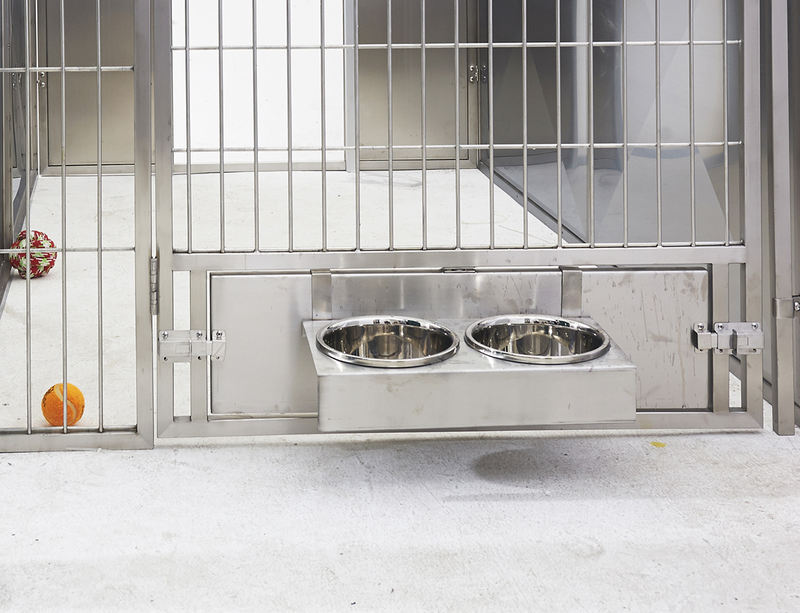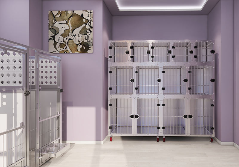 Viacúčelová klietka pre zvieratá a karanténu je vybavená zásobníkom na odpad s von skosenými okrajmi a bezšvovými chráničmi proti striekaniu, ktoré zabraňujú úniku moču. Mriežka opierky nôh využíva vysokofrekvenčné zváranie, aby sa eliminovali oddelené zvary a usadzovanie nečistôt. Zámok posuvných dverí sa automaticky zaisťuje, aby zabránil úniku domácich zvierat, pričom vybrané modely obsahujú magnetický systém dvojitého zámku.