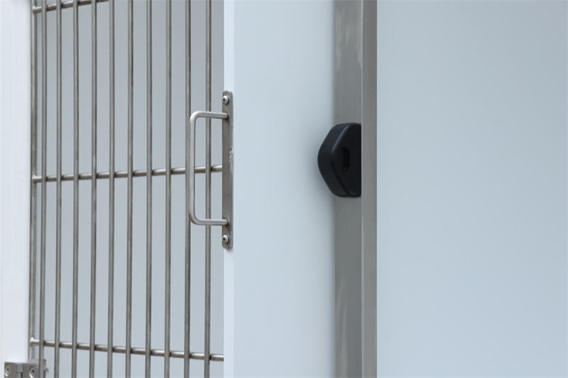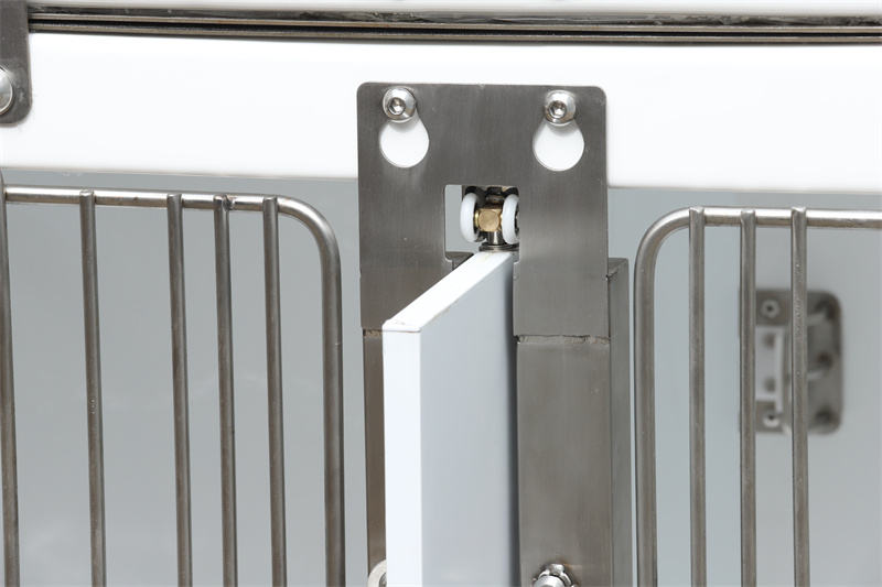 Predinštalované rozprašovacie dýzy a hadice, drenážny systém s filtrom a napájacie zásuvky ho premieňajú z obyčajnej klietky na multifunkčnú pracovnú stanicu. Elektrické zariadenia, ako sú anestetické prístroje, koncentrátory kyslíka a vyhrievacie podušky, je možné zapojiť do zásuviek a zavesiť na stredovú priečku dverí. Predné dvierka veterinárnej vodotesnej modulárnej klietky pre psov zo sklenených vlákien umožňujú inštaláciu slnečníkov cez ohyby v tvare U, ktoré blokujú slnečné svetlo a zároveň slúžia ako bariéra proti vetru.